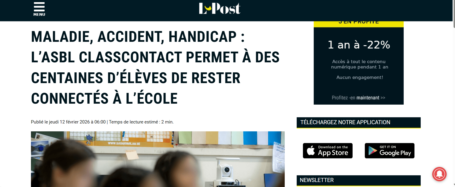 L’Post a récemment publié un article consacré à la continuité scolaire des élèves malades, mentionnant le dispositif ClassContact et son impact en Fédération Wallonie-Bruxelles.