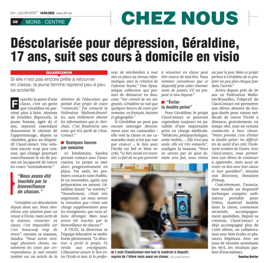 La DH (La Dernière Heure) a récemment consacré un article au parcours de Géraldine, 17 ans, déscolarisée en raison d’une dépression.