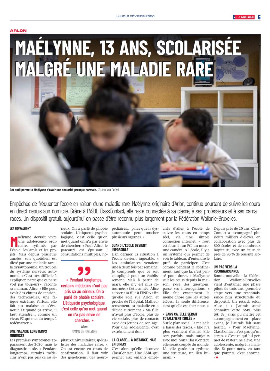 La Meuse a consacré un article au parcours inspirant de Maëlynne, 13 ans, qui poursuit sa scolarité malgré une maladie rare.