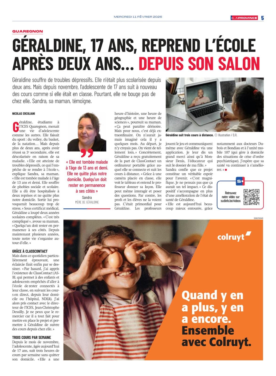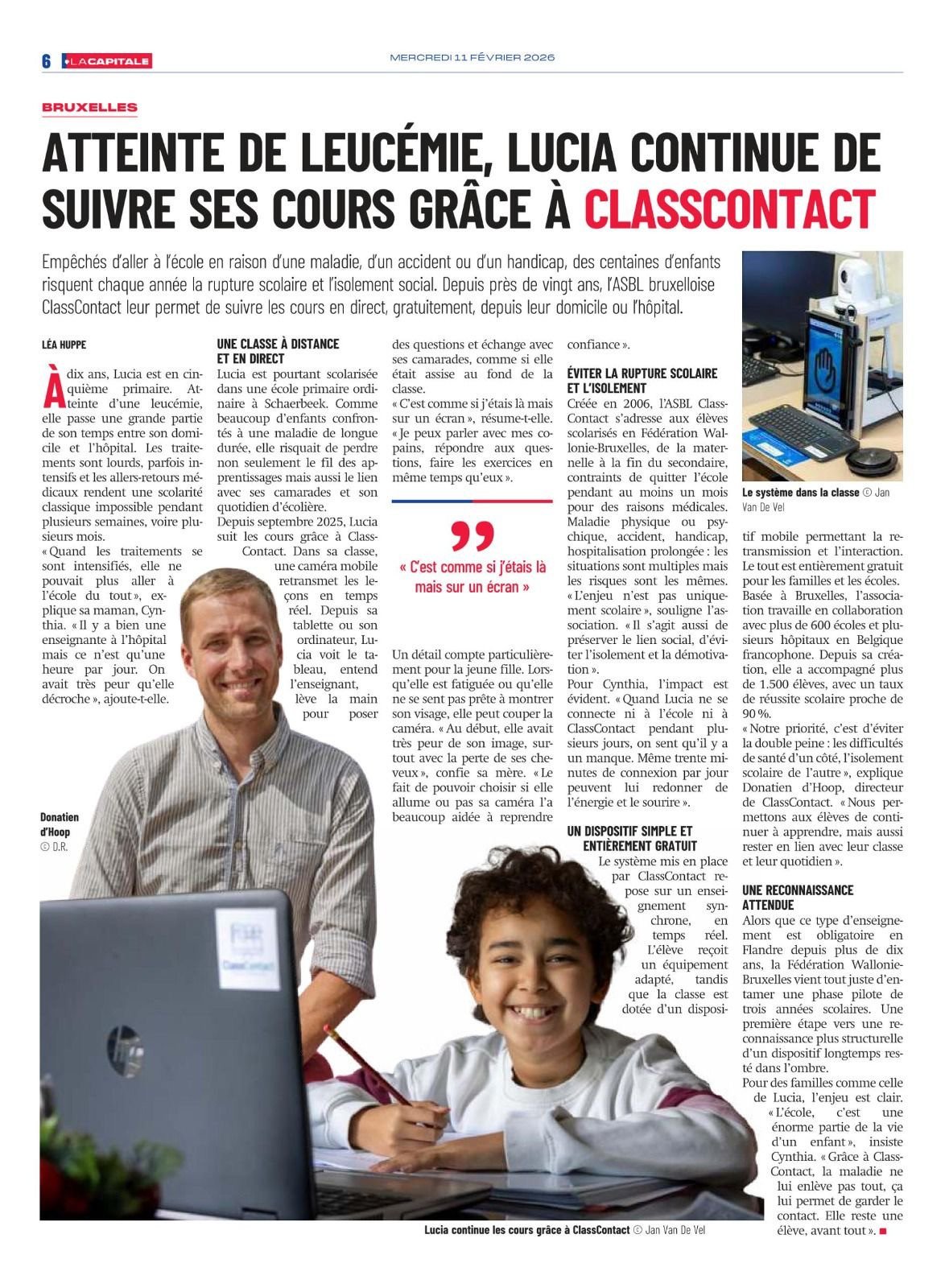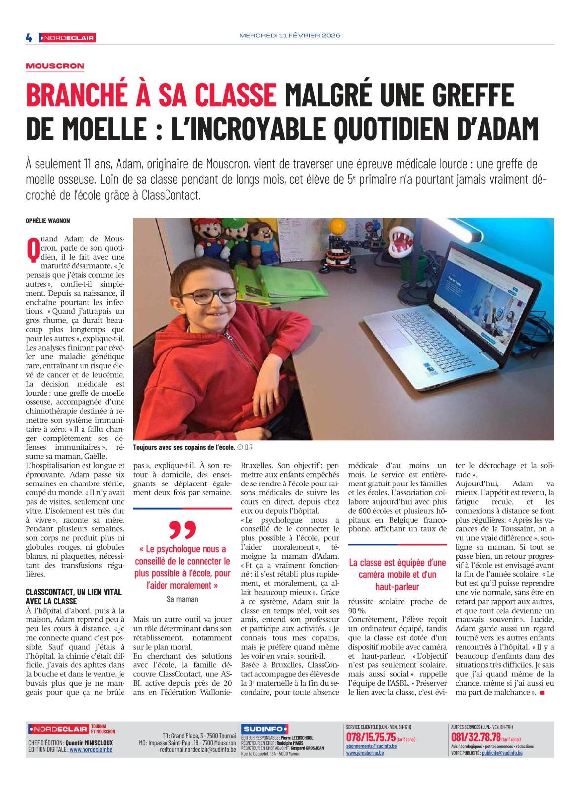 À travers les témoignages de Géraldine, Adam et Lucia, ces reportages mettent en lumière une réalité forte : grâce à ClassContact, des élèves confrontés à la maladie peuvent continuer à suivre leurs cours à distance, en temps réel, tout en restant connectés à leur classe et à leurs camarades.